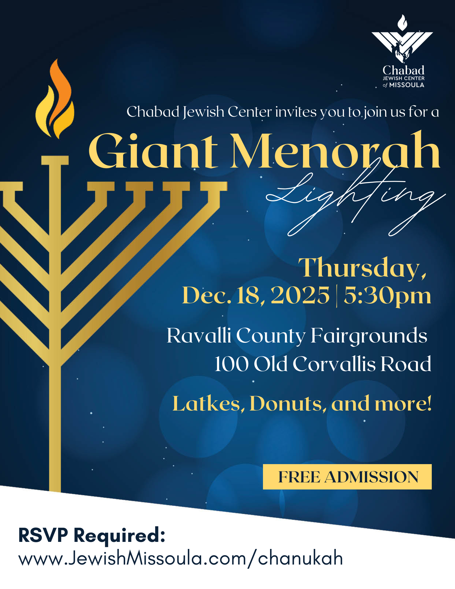Join us for our annual Giant Menorah Lighting at the entrance to the Ravalli County Fairgrounds.